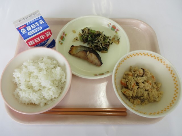 本日の献立は,ごはん,あじのしょうがやき,おかかあえ,うのはなのいりに,牛乳でした。