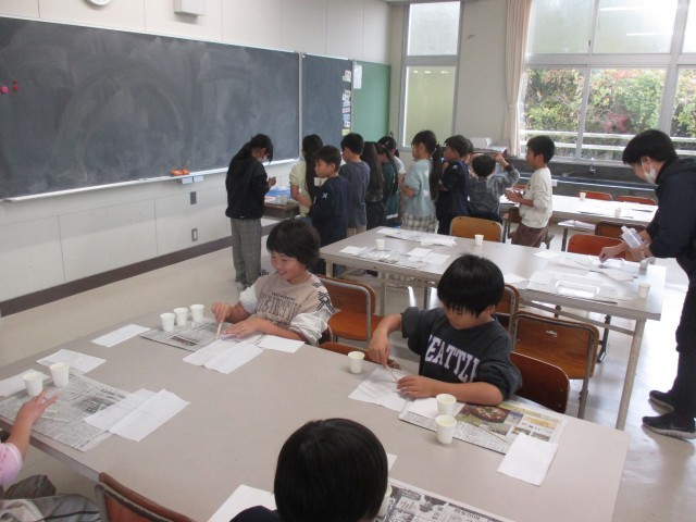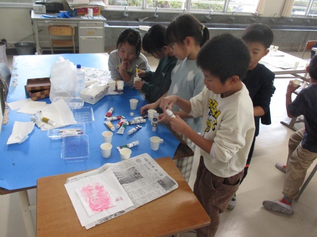 図工では、洗濯のりとアクリル絵の具を使ってマーブリングをしました。