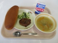 本日の献立は,ごはん,イカメンチカツ,ごぼうサラダ,しょうがスープ,牛乳でした。