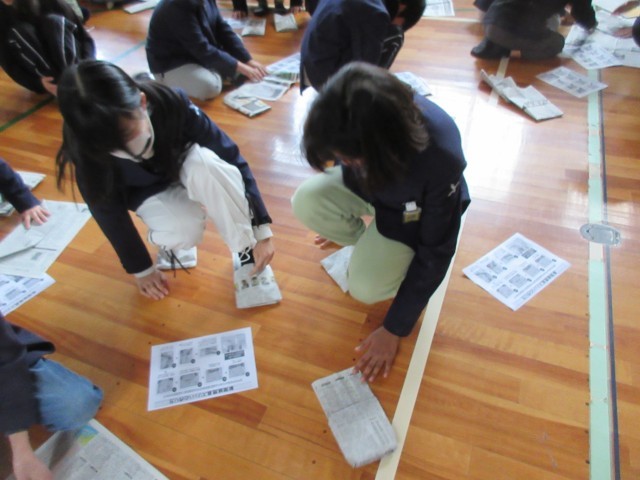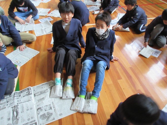 5年生 防災体験学習3 公開日 2025/11/28 更新日 2025/11/28 5年生 暗い状況で支援物資を取りに行く「暗所体験」では、けがの防止にスリッパが役立つことや懐中電灯の必要性を体感しました。その後、新聞紙を使ったスリッパを作成し、スリッパ代わりになることに驚いていました。 +3 いいね(0)