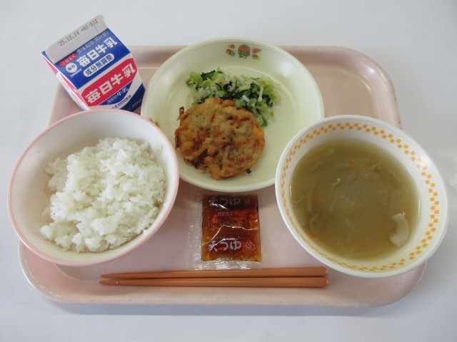 本日の献立は,こめこかきあげどんぶり,たくあんあえ,ぶたじる,牛乳でした。