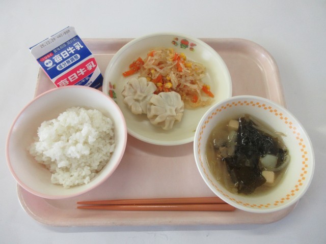 本日の献立は,ごはん,てつかるパオパオ,はるさめサラダ,ちゅうかスープ,牛乳でした。
