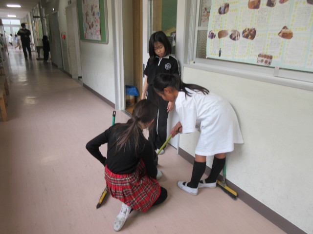 机・椅子の脚,教室の床,窓ガラス,エアコン,扇風機,廊下をきれいに掃除しました。