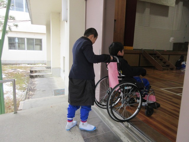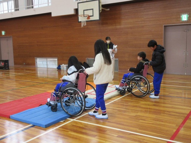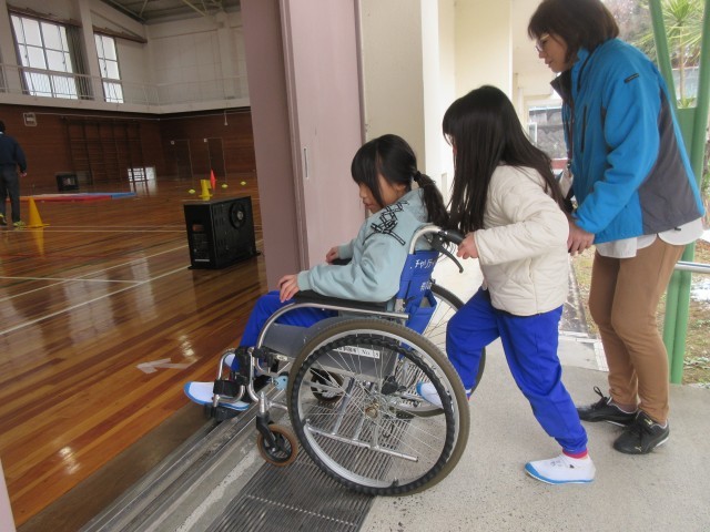 2人組になり、車いす使用者を介助する際の注意点等を教わりました。