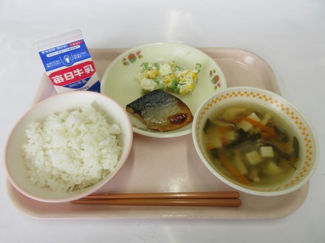 本日の献立は,ごはん,さばしょうがやき,ポテトサラダ,ふわふわどうふのすましじる,牛乳でした。