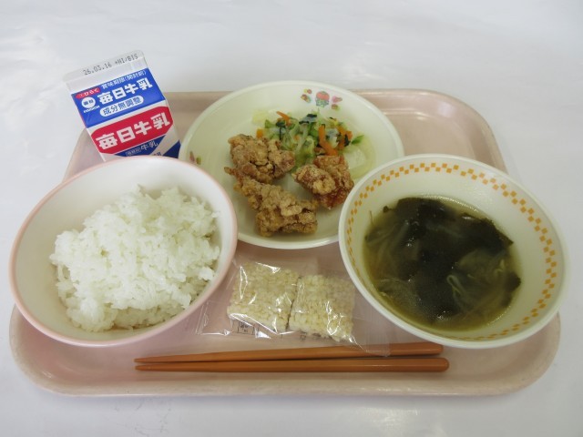 本日の献立は,ごはん,とりにくのからあげ,ちゅうかサラダ,おこげいりわかめスープ,牛乳でした。