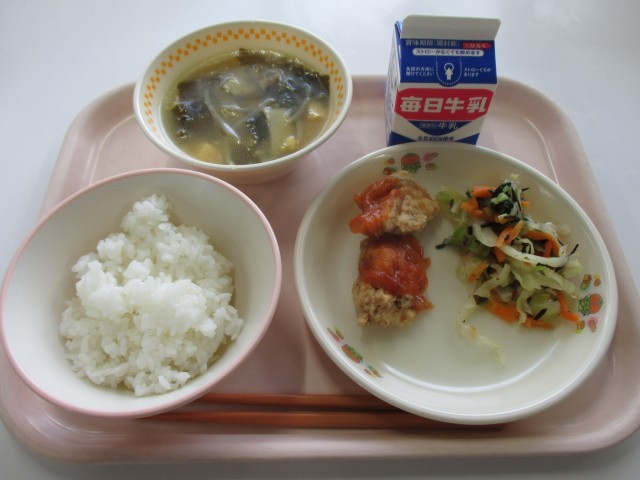 本日の献立は、ごはん・とりにくのあまずあんかけ・キャベツのちゅうかサラダ・わかめスープ・牛乳でした。