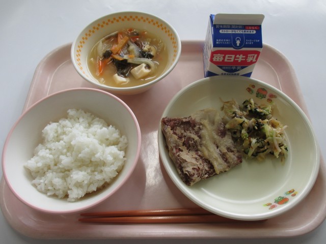 本日の献立は、ごはん・ほねくのこめこあげ・うめこんぶあえ・だいこんとにんじんのみそしる・牛乳でした。
