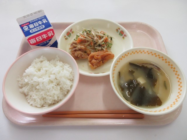 本日の献立は,ごはん,とりにくのピリッとジャン,ごぼうサラダ,わかめととうふのみそしる,牛乳でした。