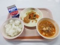 本日の献立は,パン,とりにくのスパイシーやき,サウザンサラダ,チャウダー,牛乳でした。