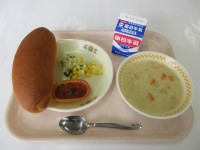 本日の献立は,パン,クリームシチュー,コールスローサラダ,なすとトマトのグラタ...