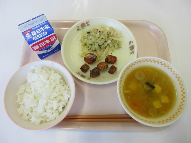 本日の献立は,ごはん,さばのコロコロたつたあげ,たくあんあえ,ぐだくさんみそし...