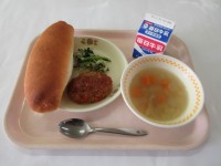 本日の献立は,パン,ハンバーグトマトソース,イタリアンサラダ,コンソメスープ,...