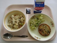 本日の献立は、だいずいりにくそぼろどんぶり・たくあんあえ・おこのみやき・牛乳でし...