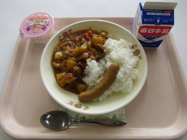 本日の献立は、ソーセージカレー・おいわいゼリー・牛乳でした。