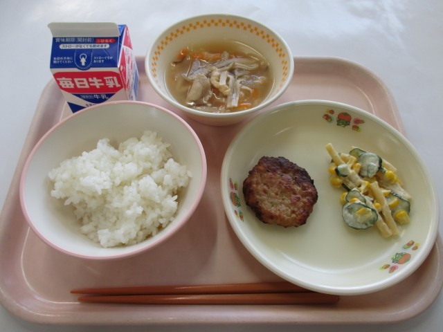 本日の献立は、ごはん・キャベツいりつくね・マカロニサラダ・さわにわん・牛乳でした...