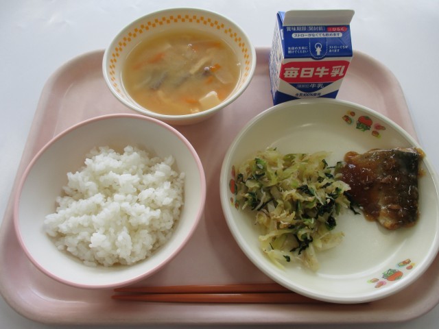 本日の献立は、ごはん・さばのおろしに・キャベツのあまずあえ・ぐだくさんのみそしる...