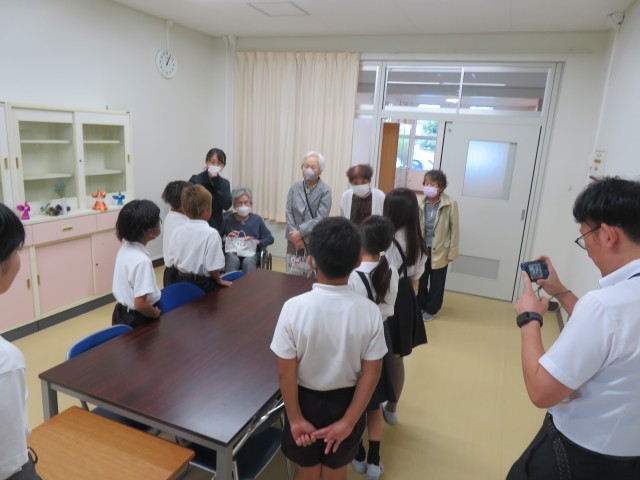 地域にあるデイサービス施設の皆さまにお越しいただき、ご高齢の皆さまが作られたものを4年生の代表者に手渡されました。