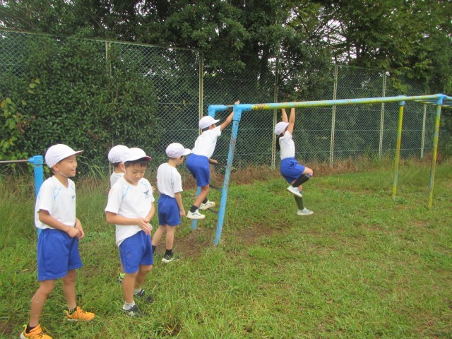 今日は、上り棒にチャレンジしたり、鉄棒で回転やぶら下がりをしたり、うんていで自分のいけるところまで進んでみたりといろんな遊具で運動をしました。