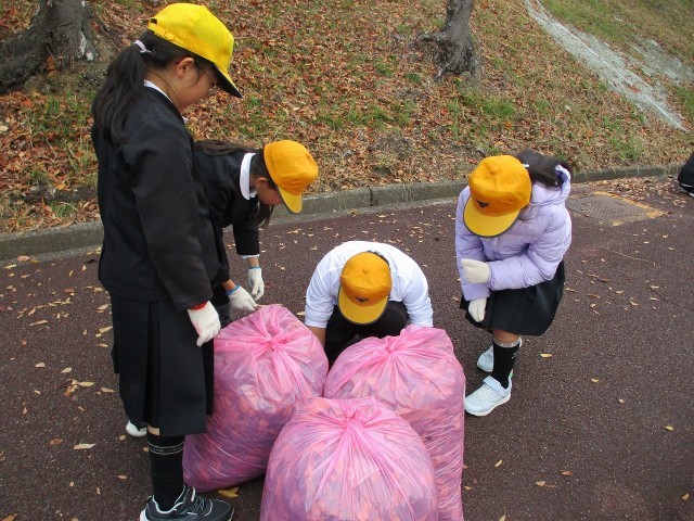 11月21日(金)にたてわり班に分かれて、校区の清掃を行いました。6年生が各班の中心となり、城山台の道や公園のごみ拾いをしました。