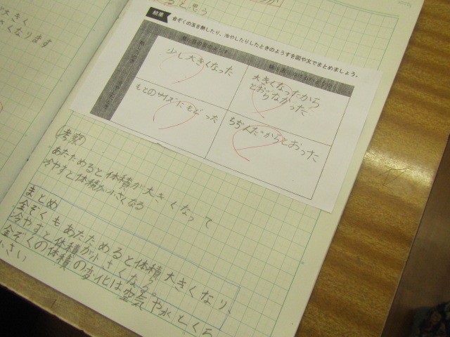 理科の授業で、熱した金属の体積と冷やした金属の体積について学習しました。