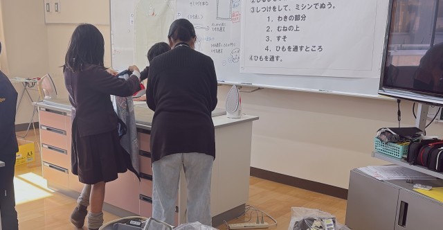 5Bがエプロン作りでボランティアさんにお手伝いいただくのは、今回が最後です。やり方がわからない時、困った時にすぐに聞くことができる、安心できる環境で取り組めたのはボランティアの皆さんのおかげです。家庭科ボランティアの皆さん、本当にありがとうございました。これからもよろしくお願いします。