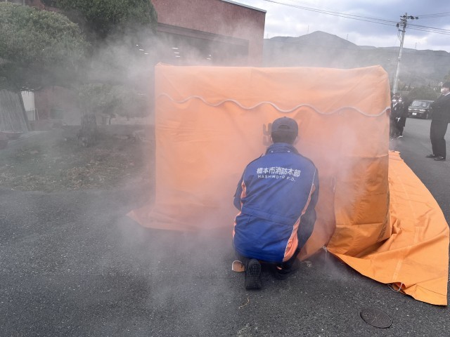 火災が発生した時、煙を吸わないように、姿勢を低く動くなど、どのようにして身を守るのか教えていただきました。