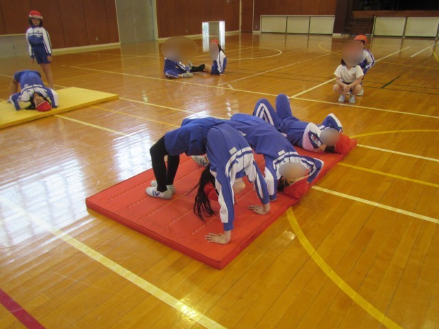 ブリッジや開脚前転などいろんな技に挑戦しています。技をきれいに美しくできるようにみんな意識しています。