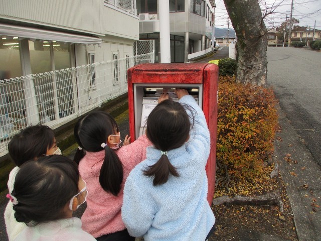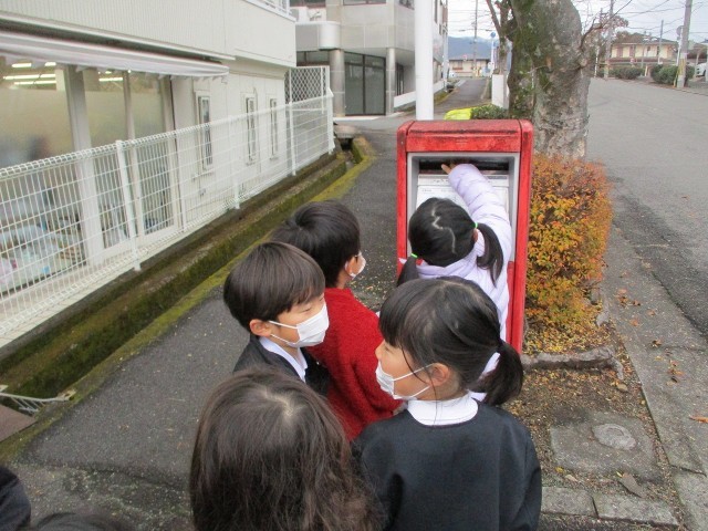 先週、昔遊びでお世話になったボランティアの皆さんに、年賀状を書いた1年生の子どもたち。今日は、書いた年賀状を自分たちで年賀状をポストに投函しに行きました。手紙をポストに入れたことがない子もいたので、自分で書いた手紙を大切そうに持っていき、丁寧に投函する姿が、とても可愛らしかったです♪