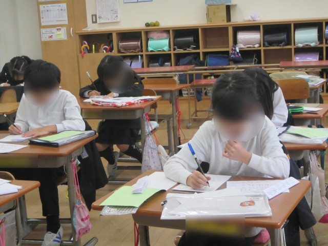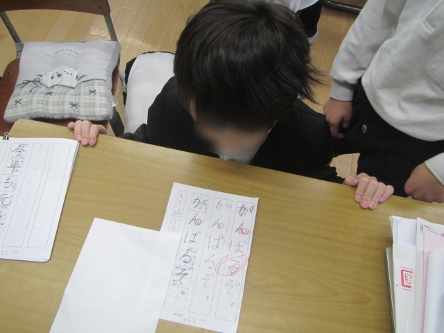12月22日(月)今日は書初練習をしました。お手本をよく見ることが大切だと話をすると、「もう少し右にしたかった。」「思っているよりも長くなってしまった。」など自分の字をどのようにすればいいかを考えている言葉をよく聞くようになりました。一生懸命に書く姿がとても素敵でした。冬休みも頑張ってくださいね!