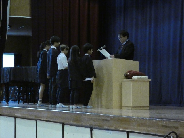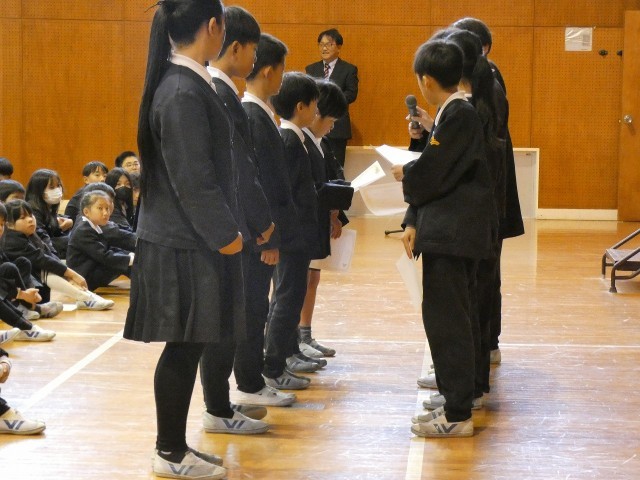 5時間目に冬休み前集会を開きました。校長先生や生徒指導の先生のお話を聞くとともに、マラソン大会や楽しんでくだ祭などたくさんの表彰も行いました。