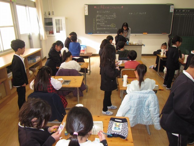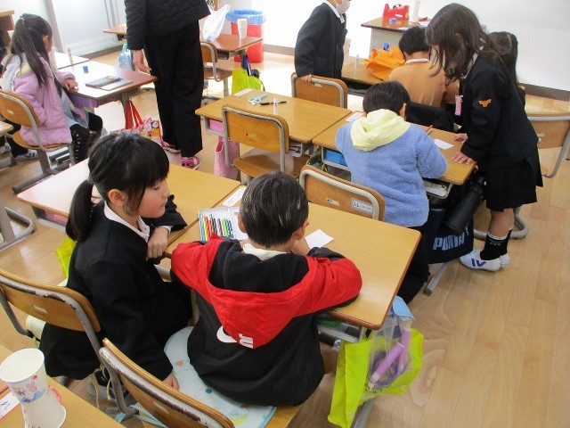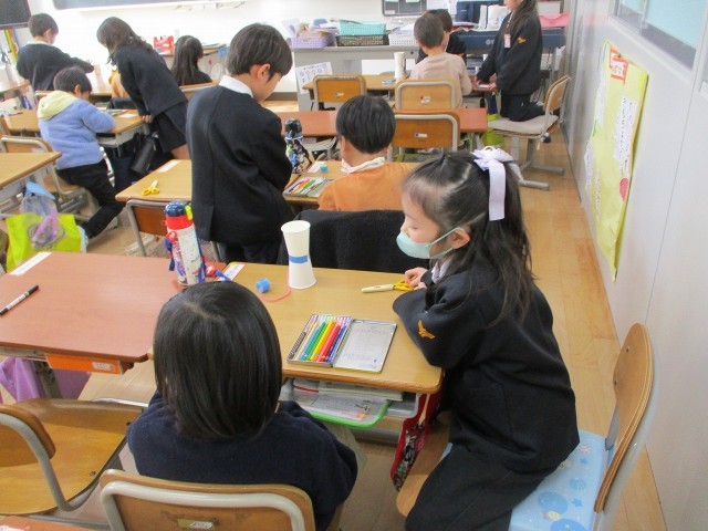 今日は、4月に城山小学校に入学するお友達が、学校に体験入学に来ました。一緒に工作をするために、冬休み明けから準備をしてきた1年生の子どもたちは、新1年生に会えるのを楽しみにしていました♪はじめのうちは、とても緊張した表情で、工作をしていた子どもたちでしたが、出来上がった紙コップのけん玉で一緒に遊び始めると、素敵な笑顔もたくさん見られました。1年生は、一生懸命作り方を教えたり、けん玉のこつをアドバイスしたりして、お兄さんお姉さんらしく、とても頼もしい姿を見せてくれました!4月の入学式に、また会えるのが楽しみですね♪