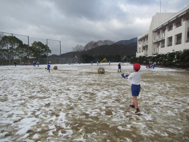 昨日の雪が運動場に積もっていたので、今日の体育は雪遊びをしました。
