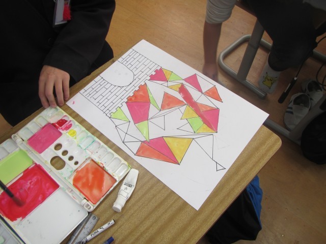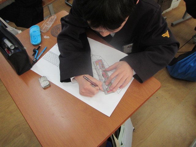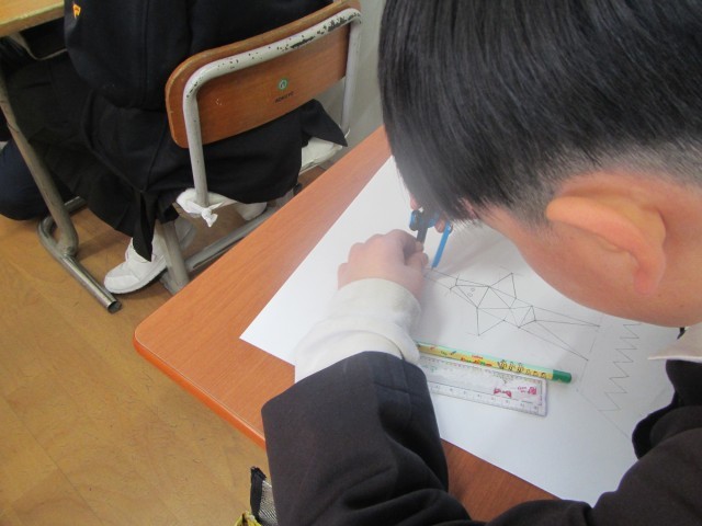 題名は「三角の城」です。お城の塔になる部分をコンパスを使って三角形を描いて積み上げていきます。