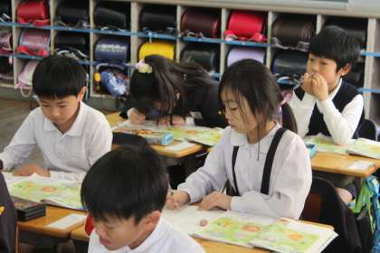 動物の絵の周りに3つまたは4つの点があり、その点をむすんで三角形や四角形の形を作りました。「3本の直線で囲まれた形を三角形、4本の直線で囲まれた形を四角形という。」という言葉も習いました。