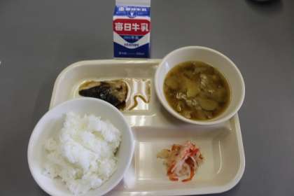 今日の給食の献立は、ごはん・ブリの照り焼き・大根なます・豚汁・牛乳です。豚汁は、はたごんぼ入りです。ごちそうさまでした。