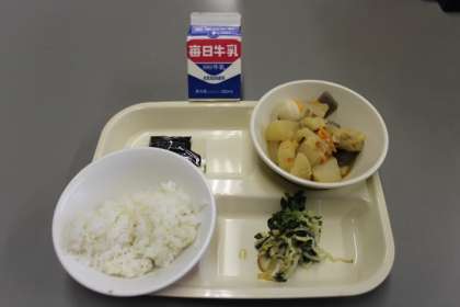 今日の給食の献立は、麦ごはん・関東煮・ホウレンソウと竹輪の酢味噌和え・ひじきのり・牛乳です。ごちそうさまでした。
