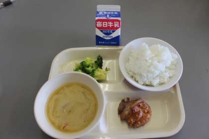 今日の給食の献立は、ごはん・鶏肉のスパイシー焼き・ボイルブロッコリー・ご汁・牛乳です。ごちそうさまでした。