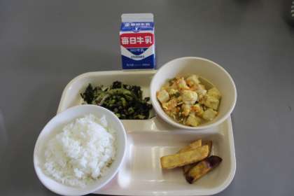 今日の給食の献立は、ごはん・高野豆腐のたまごとじ・ひじきと枝豆のおかか和え・蜜おさつ・牛乳です。ごちそうさまでした。