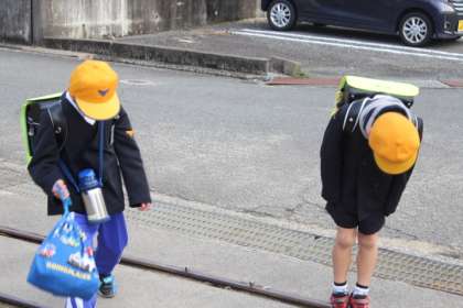 「おはようございます!」立ち止まってあいさつをしています。今日も一日がスタートしました。
