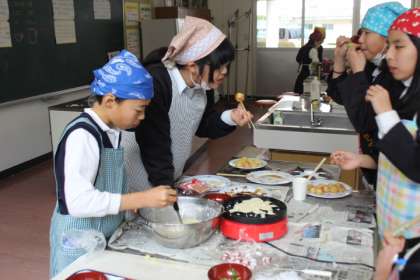 今日は6年B組、調理実習!!!以前、みんなで相談して、たこ焼きを作ることになっていました。今日は、みんなでたこ焼き器を持ち寄って、一食分の食事作りが始まりました。