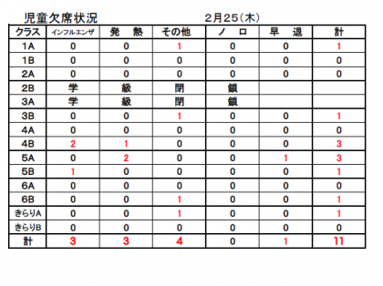 ☆ 2月25日(木)の欠席状況