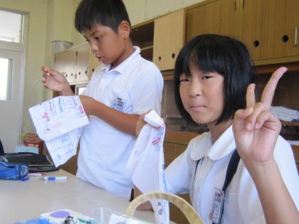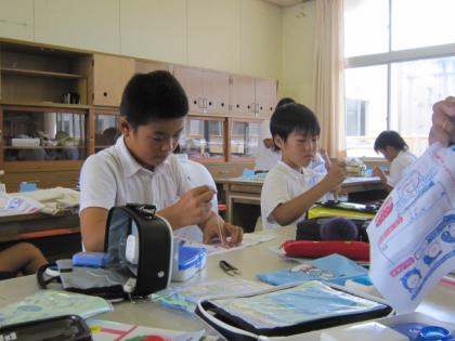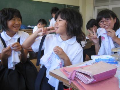 今日は3種類の縫い方の練習です。並縫い、本返し縫い、半返し縫い。みんな真剣です。慣れてくると、あちこちでスマイル、スマイル(*^。^*)