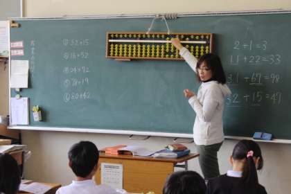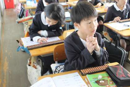 ☆ 3B 算数 少人数1 公開日 2016/03/11 更新日 2016/03/11 3年生 3月11日(金) 算数の時間、「そろばん」をしています。そろばんの部分の名前を覚えたり、一だまは、親指でいれる、五だまは人差し指でなど覚えることがいっぱいです。いれたりはらったりは、随分慣れてきています。今日は、たし算をしました。くり上がりがでてくると、「うーん。」と悩んでいます。難しい計算のところは、みんなで一斉に練習しました。 いいね(0)