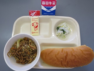 今日の給食の献立は、パン・焼きそば・菜の花と大根のサラダ・チーズ・牛乳です。ごちそうさまでした。