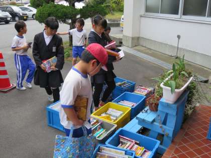 手さげバッグいっぱいの借りた本を返却する子、好きな分野(生き物)の本を選んで大事そうに抱えて手続きを待つ子、本が好きなことが伝わってきました。