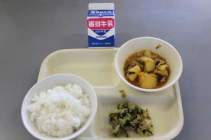 今日の給食の献立は、ごはん・じゃが豚キムチ・磯香和え・牛乳です。ごちそうさまでした。