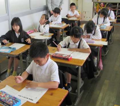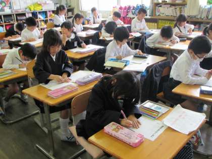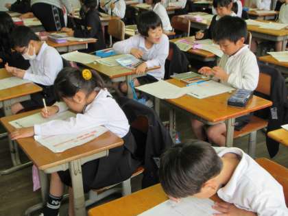 1年生に学校の中を案内したことを振り返って、ワークシートに書きました。