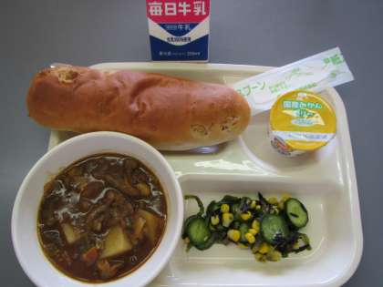 今日の給食の献立は、クルミパン・ビーフシチュー・海藻サラダ・国産みかんゼリー・牛乳です。ごちそうさまでした。