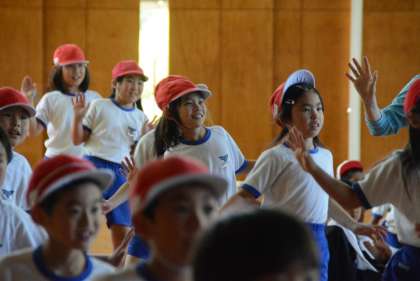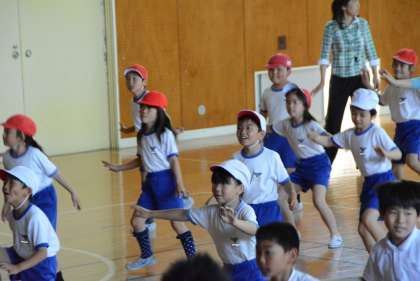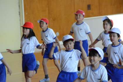 曲のリズムに合わせて、動作をします。横に動いたり、片足で立ったり、速いテンポに遅れないように踊りました。